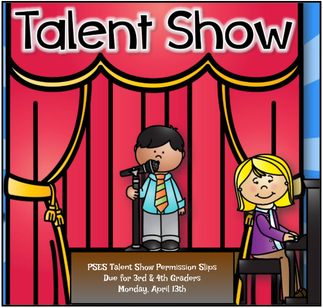 Talent Show Permission Slips DUE (3rd & 4th graders ONLY!) Permission Slip Due on Monday, April 13th by the end of the school day!